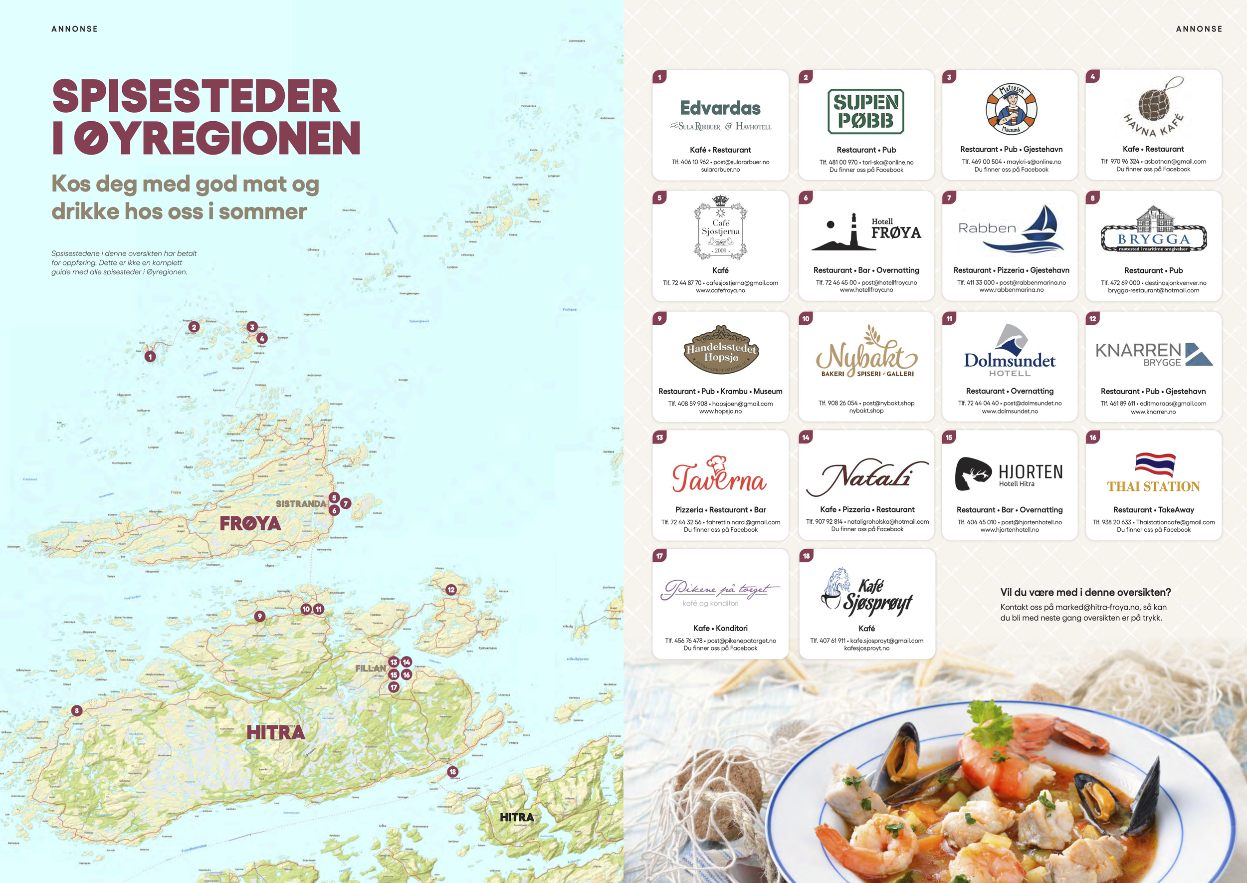 I Øymagasinet Sommer har spisesteder mulighet til å være med i en kartoppføring. På den måten er det enklere for både fastboende og turister å finne nye spennende spisesteder. En kartoppføring har en pris på kr. 1.500,-, men om du bestiller din egen annonse i magasinet, så er kartoppføring inkludert uten ekstra kostnad.